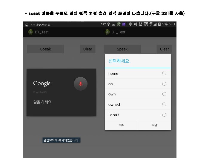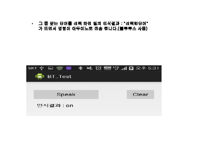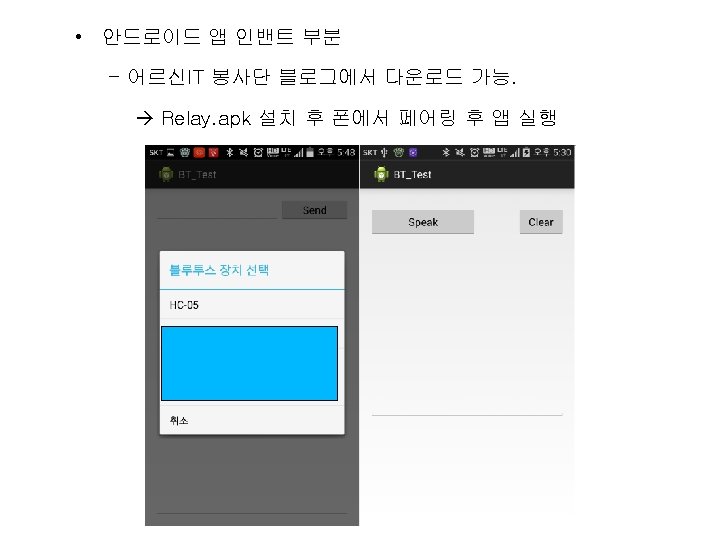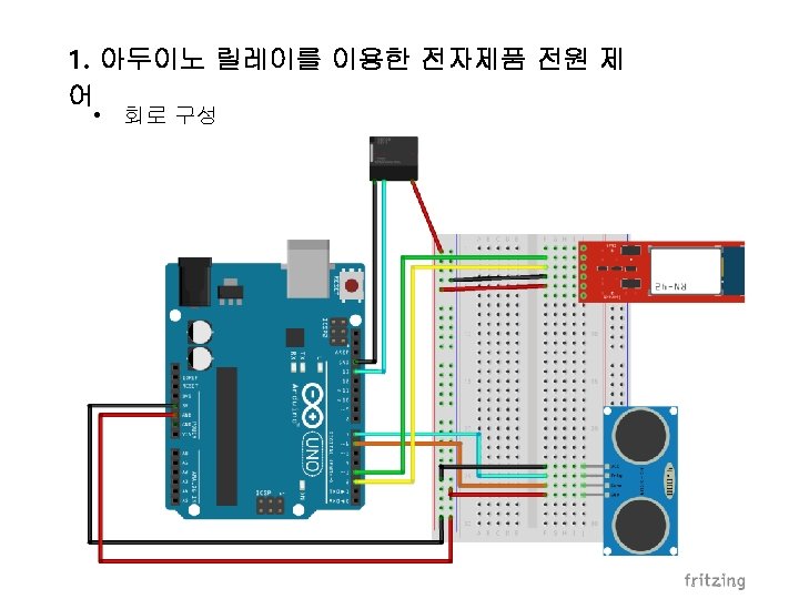 • 코딩 부분 #include <Software. Serial. h> while (1) { float duration, distance; digital. Write(trig. Pin, HIGH); delay(10); digital. Write(trig. Pin, LOW); Software. Serial BTSerial(2, 3); int buffer. Position; int echo. Pin = 6; int trig. Pin = 7; int relay = 13; // 초음파 거리 센서는 6, 7번핀, 릴레이는 13번 핀에 연결 sen. Dur = pulse. In(echo. Pin, HIGH); sen. Val = ((float)(340 * sen. Dur) / 10000) / 2; // 초음파 거리 센서에서 보낸 데이터에서 거리를 측정 Serial. println(sen. Val); if (sen. Val < 40) // 40 cm내에 사람이 있을 경우 { digital. Write(relay, HIGH); // 릴레이를 작동 } else { digital. Write(relay, LOW); // 없을 경우 릴레이를 끔 } delay(200); // 0. 2초 대기 float sen. Val = 0; float sen. Dur = 0; void setup() { Serial. begin(9600); BTSerial. begin(9600); buffer. Position = 0; pin. Mode(relay, OUTPUT); pin. Mode(trig. Pin, OUTPUT); pin. Mode(echo. Pin, INPUT); } void loop() { if (BTSerial. read() == '4') { // 안드로이드에서 stop 입 력 break; // 초음파 거리 센서로 조정 하는 것을 멈춘다. } } if (BTSerial. available()) { byte data = BTSerial. read(); // 블루투스로 안드로이드에서 보내준 데이터를 받는다. if (data == '1') { // 안드로이드에서 on을 입력 시 digital. Write(relay, HIGH); } else if (data == '2') { // 안드로이드에서 off를 입력 시 digital. Write(relay, LOW); } else if (data == '3') { // 안드로이드에서 auto를 입력 시 } } }