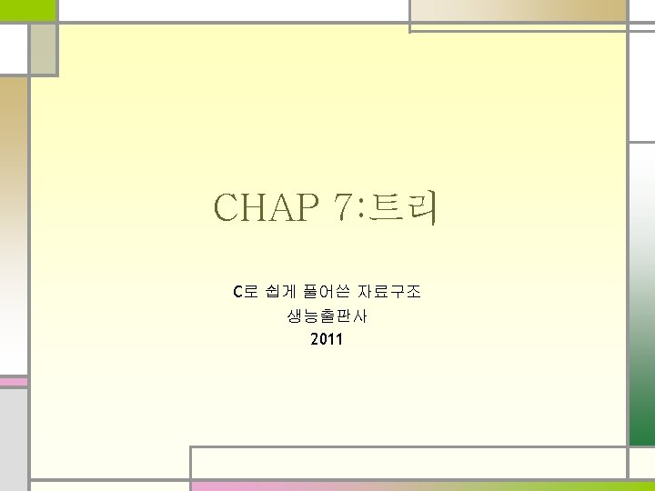 디렉토리 용량 계산 프로그램 int calc_direc_size(Tree. Node *root) { int left_size, right_size; if ( root ) { left_size = calc_direc_size( root->left ); right_size = calc_direc_size(root->right ); return (root->data+left_size+right_size); } return 0; } void main() { Tree. Node n 4={500, NULL}; Tree. Node n 5={200, NULL}; Tree. Node n 3={100, &n 4, &n 5}; Tree. Node n 2={50, NULL}; Tree. Node n 1={0, &n 2, &n 3}; printf("디렉토리의 크기=%dn", calc_direc_size(&n 1)); © 생능출판사 2011 } C로 쉽게 풀어쓴 자료구조