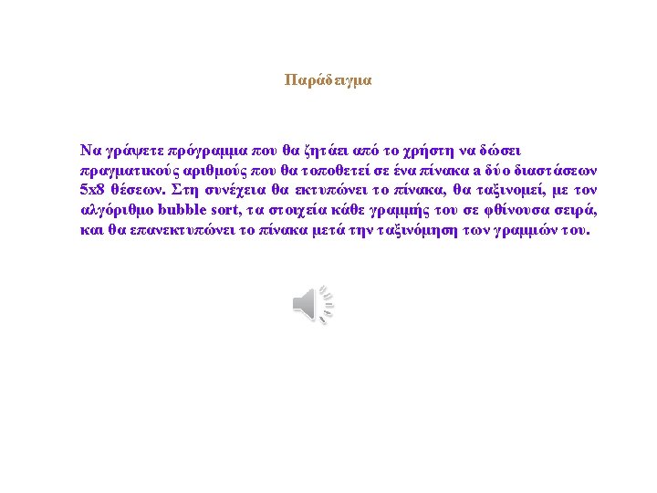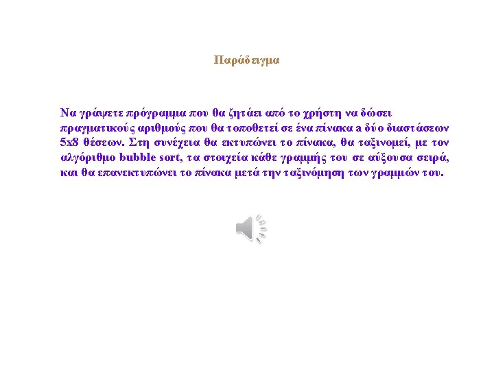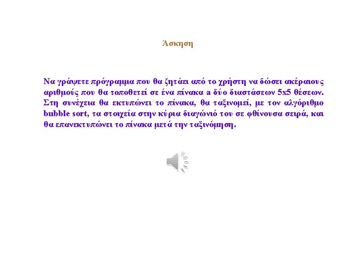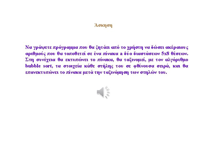 for (i=0; i<5; i++) { for (j=0; j<7; j++) { for (k=j+1; k<8; k++) { if (a[i][j]>a[i][k]) { y=a[i][j]; a[i][j]=a[i][k]; a[i][k]=y; } } cout<<endl<<"n. The array a after sorting: "; for (i=0; i<5; i++) { cout<<endl; for (j=0; j<8; j++) cout<<a[i][j]<<" "; } return 0; }