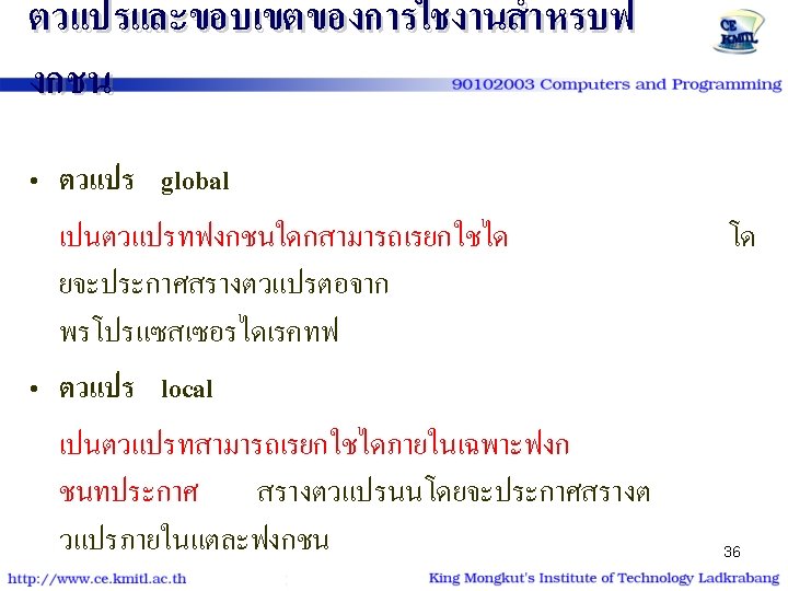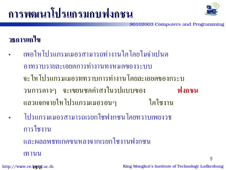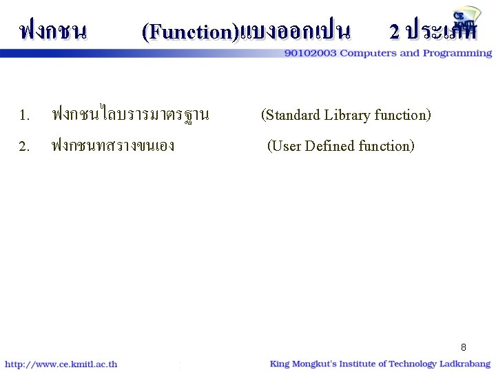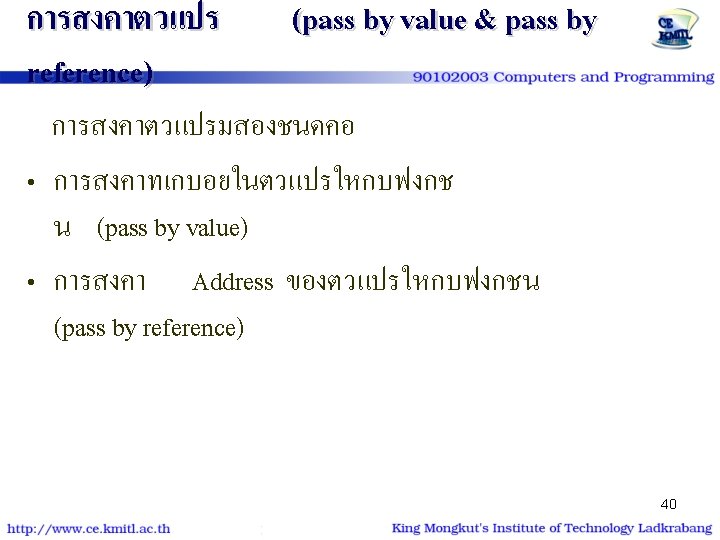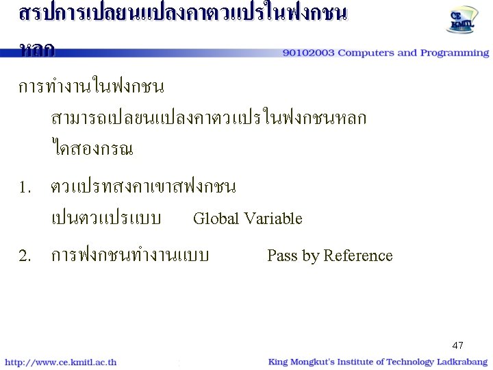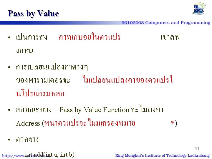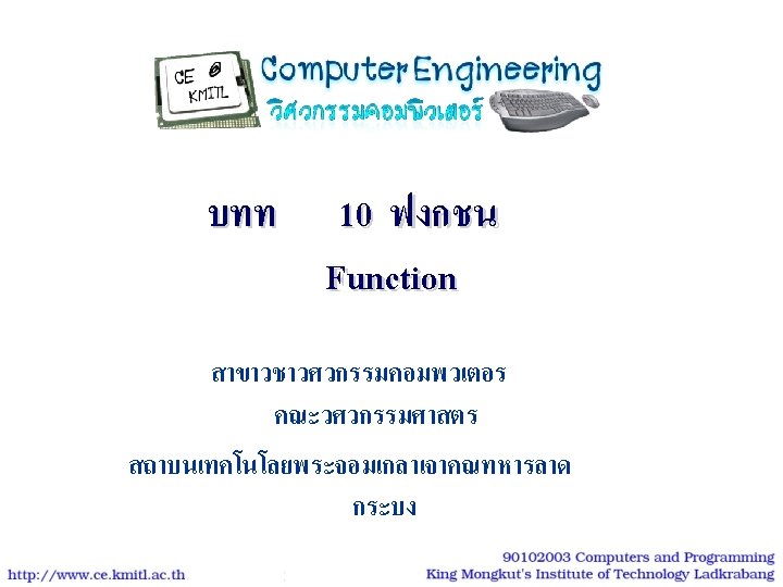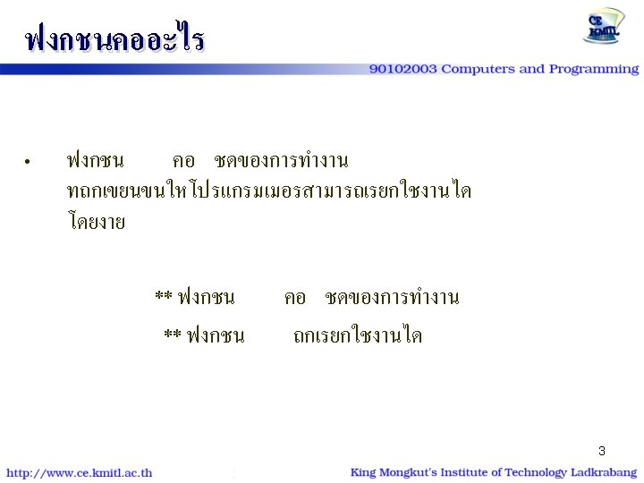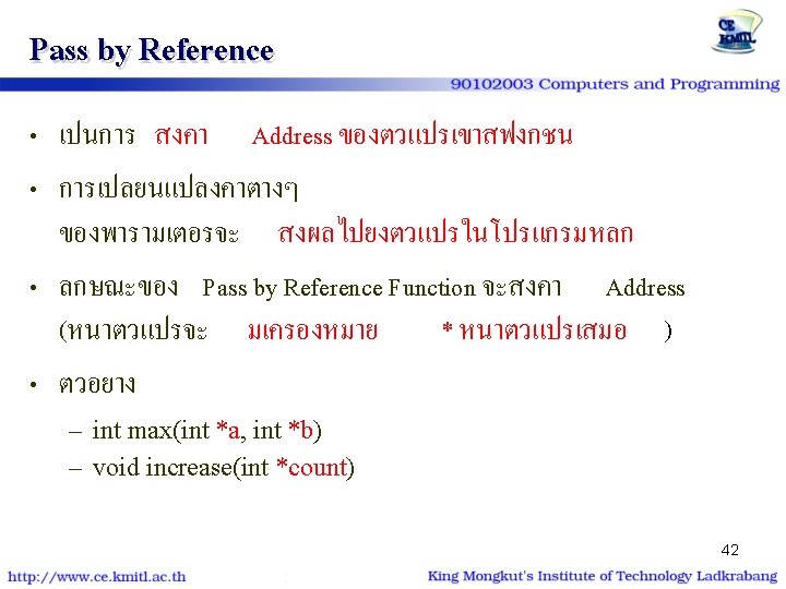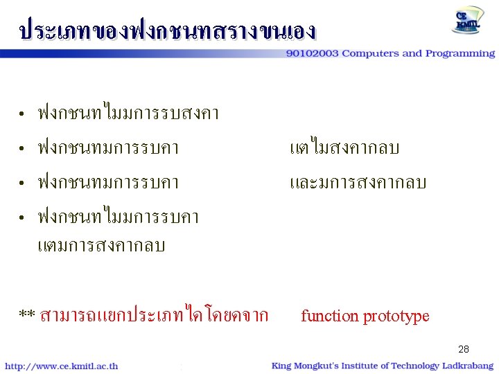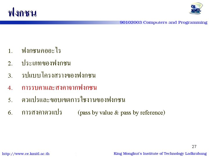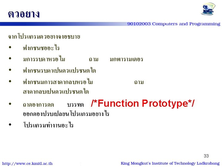 ตวอยาง | โปรแกรม #include<stdio. h> #include<conio. h> void show_star (int n) { int i; for (i=1; i<=n; i++) putchar('*'); } int main() { int num=9; show_star(num); printf ("n* kmitl *n"); show_star(num); return 0; } #include<stdio. h> #include<conio. h> void show_star (int); int main() { int num=9; show_star(num); printf ("n* kmitl *n"); show_star(num); return 0; } void show_star (int n) { int i; for (i=1; i<=n; i++) putchar('*'); 26 }