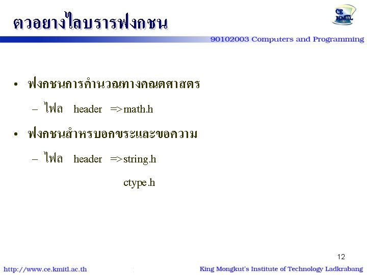 ฟงกชนการคำนวณทางคณตศาสตร #include<math. h> sin(var); cos(var); tan(var); sqrt(var); pow(var 1, var 2); log(var); log 10(var); exp(var); fabs(var); 13