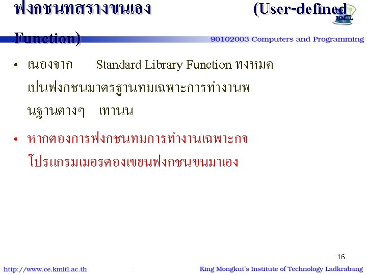 ฟงกชนสำหรบขอความ #include<string. h> strcpy(str 1, str 2); strcat(dest 1, src 2); strcmpi(str 1, str 2); strlen(str); #include<ctype. h> tolower(ch); toupper(ch); 15