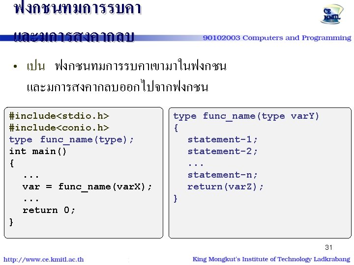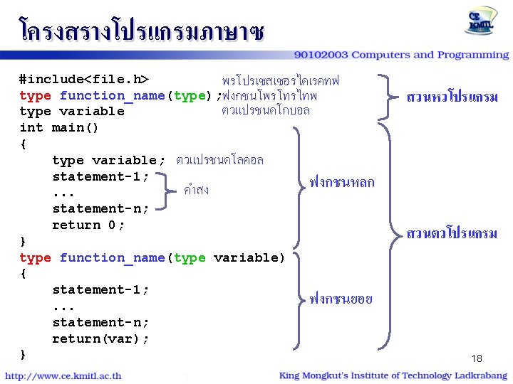 สรางฟงกชนหลก #include<file. h> type function_name(type); type variable int main() { type variable; statement-1; . . . statement-n; return 0; } type function_name(type variable) { statement-1; . . . statement-n; return(var); } 24