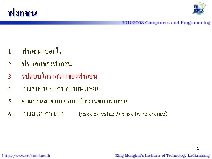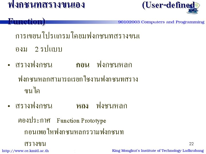 ฟงกชนทสรางขนเอง Function) type function-name (type); int main() {. . . y=function-name(x); . . . return 0; } (User-defined type function-name (type) {. . . return ? ; } 20