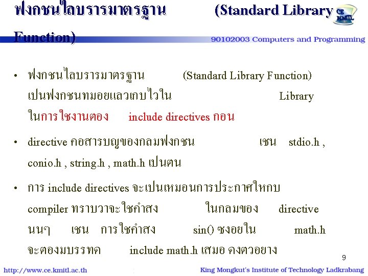 ตวอยางการใชงานฟงกชนการคำนวณทางคณ ตศาสตร #include<stdio. h> #include<conio. h> #include<math. h> #define PI 3. 14 int main() { float deg, rad; printf ("Enter Degree : "); scanf ("%f", °); rad = deg * PI / 180; printf ("sin(%. 2 f) = %. 3 fn", deg, sin(rad)); printf ("cos(%. 2 f) = %. 3 fn", deg, cos(rad)); printf ("tan(%. 2 f) = %. 3 fn", deg, tan(rad)); return 0; } 14