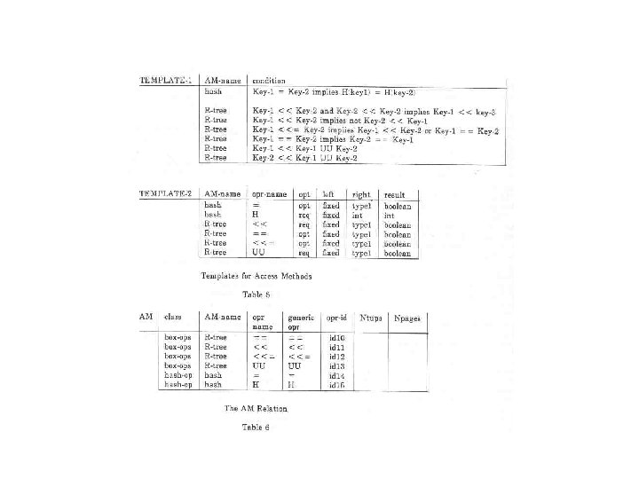 Example (cont’d) • Appropriate information recorded on two access method templates: - TEMPLATE-1 describes conditions which must be true for the operators provided by the access method (only used by humans) - TEMPLATE-2 provides necessary information on the data types of operators • In AM relation, designer can implement one or more collections of operators which satisfy the template