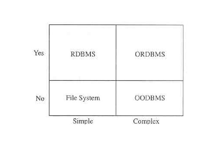 Why ORDBMS? • Allows the addition of complex data and the use of a query language to access this data (e. g. insurance) • Conveniently supports new applications (e. g. Internet, photography)