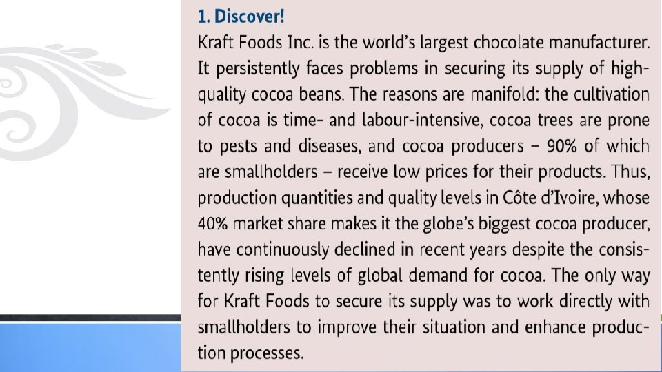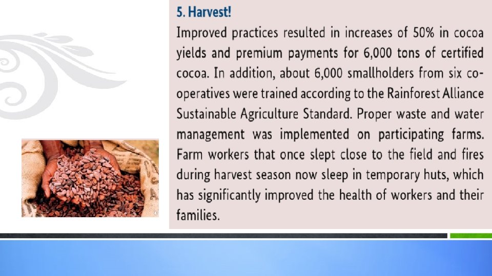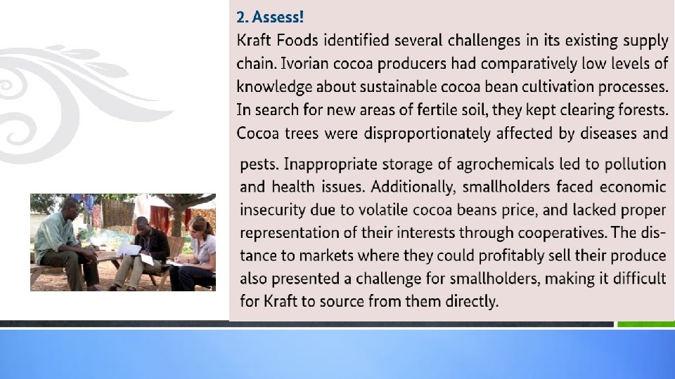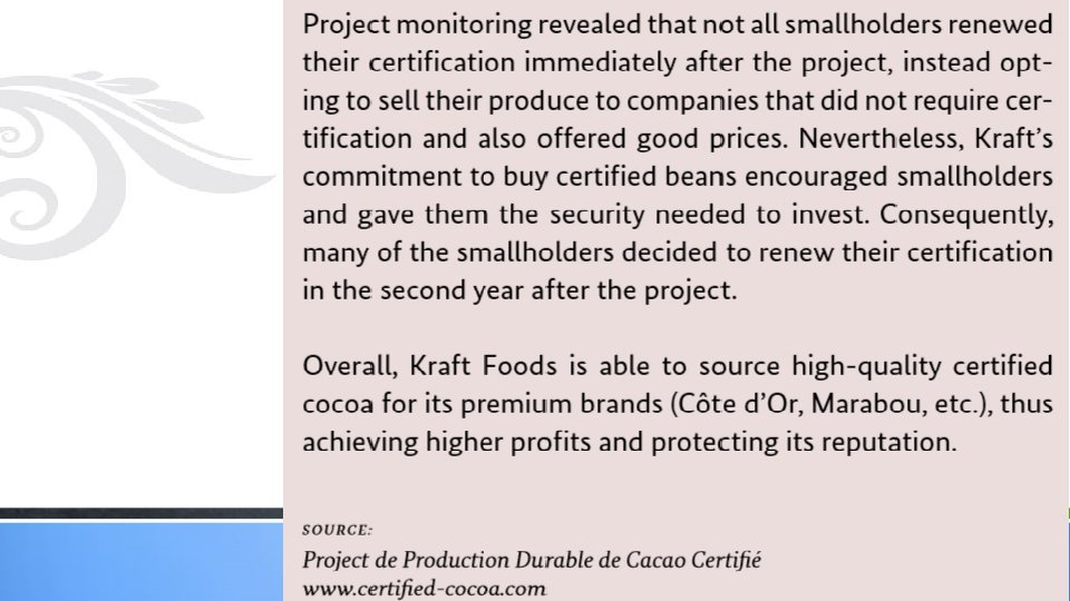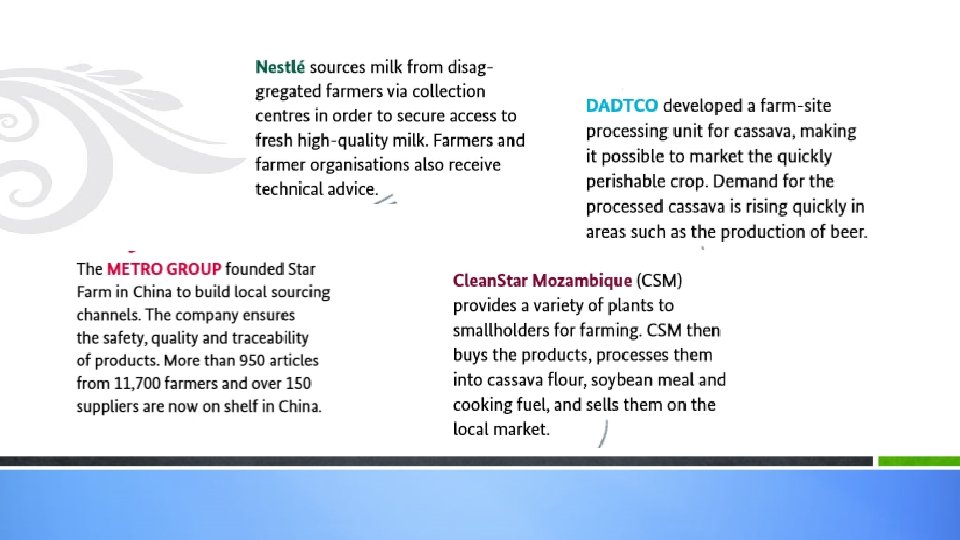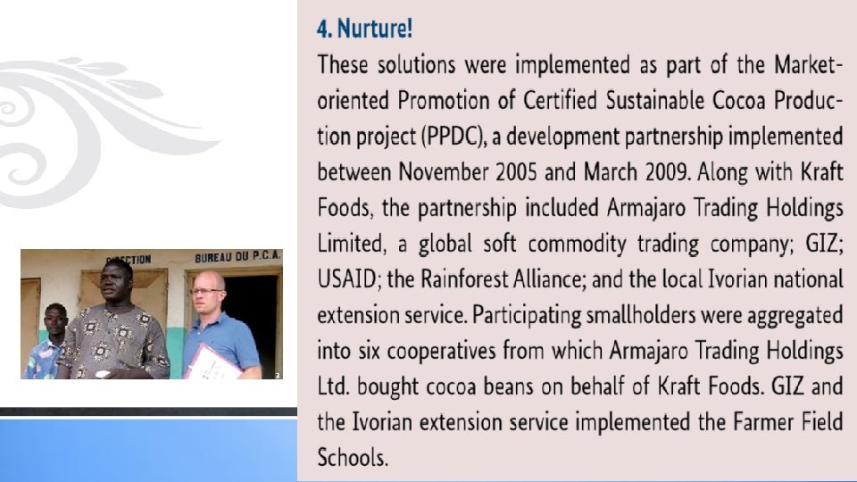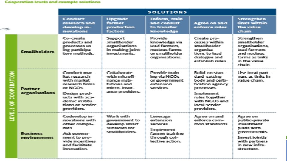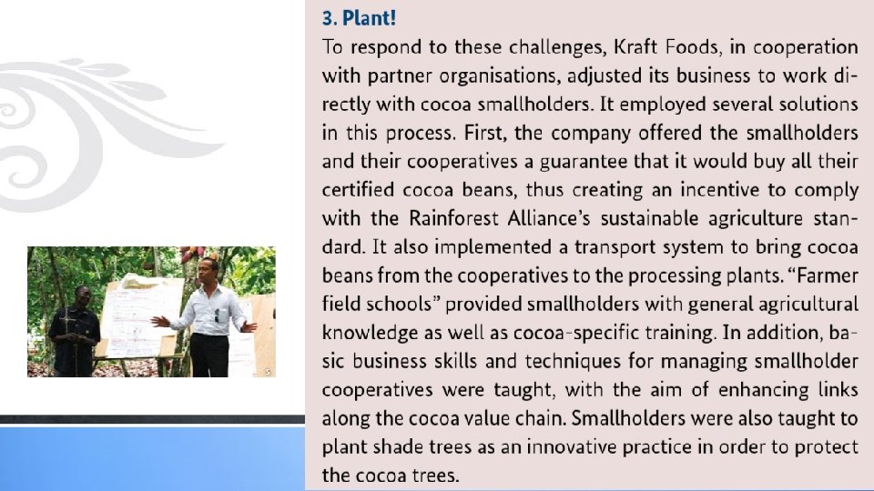 General Agronomic Education Teaches Smallholders Agricultural Best Practices And General Farm Management Techniques. Solution 3: Inform, train and consult to transfer knowledge Product-specific training focuses on the cultivation and management of a particular crop or livestock. For instance, Nestlé teaches smallholders to understand the connection between cow nutrition and milk quality. Farmer-organisation capacity building educates smallholders on how to organise and manage cooperatives. Compliance training teaches smallholders to implement processes required to meet various standards and obtain certification. For example, cocoa producers were trained by Kraft Foods** to comply with the Rainforest Alliance’s Sustainable Agriculture Standard. Business training provides smallholders with skills to manage their farm as a business, including accounting, stock management, cash flow management, and investment, planning and strategy techniques.
