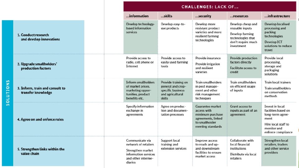 Solution 1: Conduct research and develop innovations Companies sourcing from smallholder farmers need to know what products are being produced, and what inputs and practices are being used. Participatory approaches are critical in order to understand other relevant issues and potential solutions from the perspective of the business partners Innovative Technologies Can Range From IT Solutions To Cropping Systems. Research And Development Can Hence Be A Critical Enabler For Inclusive Agribusiness.