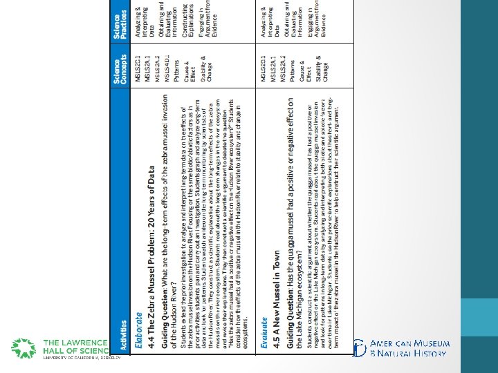 Example Activity • From a model middle school NGSS-aligned unit on Ecology • Overarching issue in chapter: invasive species (Zebra mussel in the Hudson River) • Final activity in the chapter • Evaluate activity in the 5 E cycle