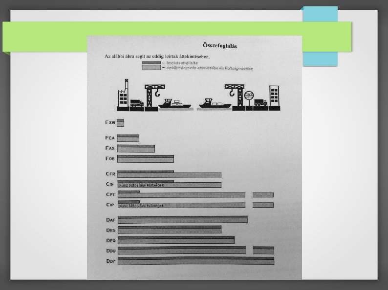 INCOTERMS 2010 ● Vízi klauzulák: ● FAS ● FOB ● CFR ● CIF ● Megszűnik: CPT, CIP, FCA