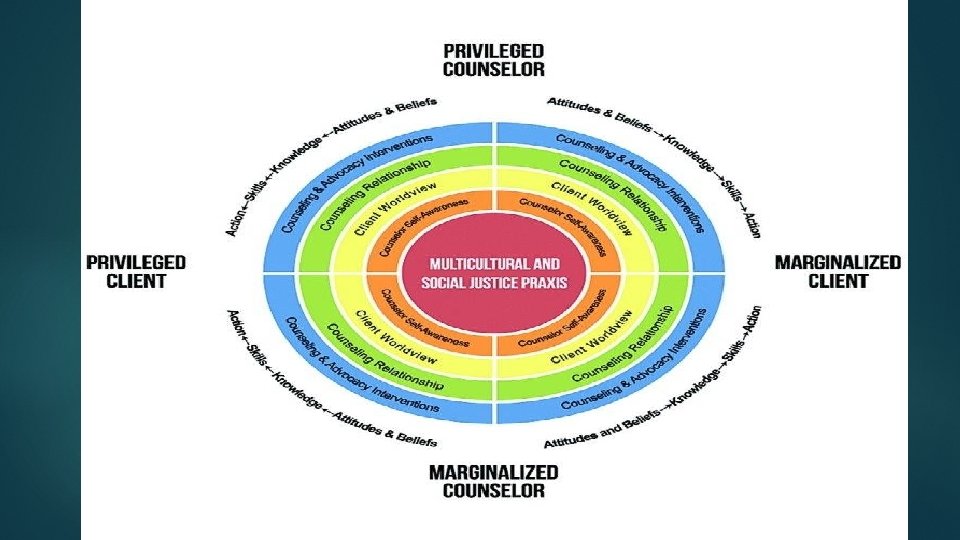 Multicultural/Social Justice Constantine et. al. 2007 Multicultural – skills to work with people of different backgrounds – world views, oppression histories, culturally specific mental health interventions for marginalized populations Social Justice – valuing equity, rights, treatment for marginalized groups, understanding the impact of systems on a larger level, often involves action Goodman -2004 Micro-individuals and families; meso – communities organizations; macro – ideologies social structures policies Vera and Speight - resources