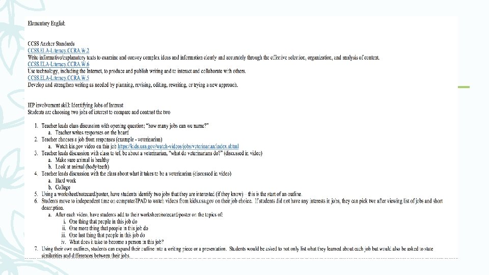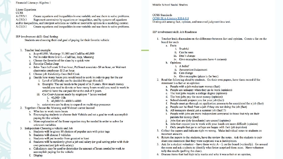 Example Lesson Plans both – Math – CCSS ELA continuum (Mc. Connell, 2016) – ELA – Social Studies Lesson Plan (middle school) – English Lesson Plan (elementary school) – NTACT