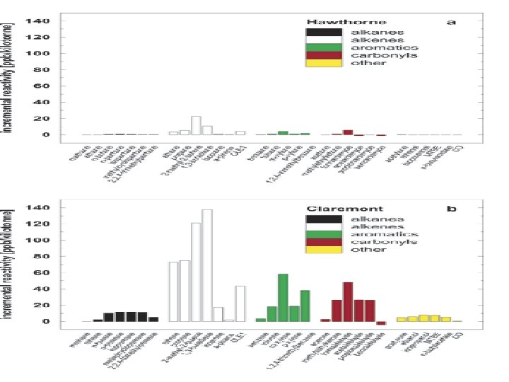 (Selections from) Results n AIR much higher inland than on the coast n n Alkanes not very reactive; alkenes more reactive than previous 1 D model n n Inland sites downwind of most emissions Low level of radicals inland alkenes that produce radicals had big effect Biogenic alkenes less influential n Mostly emitted downwind of sites