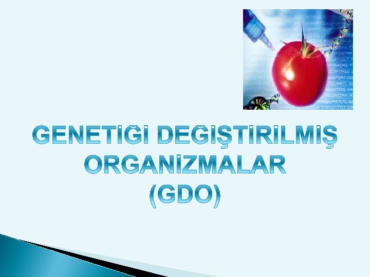 İçindekiler; GDO Nedir? GDO’nun Tarihçesi Neden GDO? Gen Transfer Aşamaları Bitkilerde ve Hayvanlarda Gen Transferi GDO’nun olumlu ve olumsuz yönleri İnsan Sağlığına Etkisi GDO’nun Biyolojik Çeşitliliğe Etkisi GDO’un Çiftçiye Yararları ve Zararları Hukuki Boyut GDO’nun Dünya’daki ve Türkiye’deki Yeri Toplumun Bakış Açısı Üretilen GDO’lar Sonuç ve Alınabilecek Önlemler Kaynakça