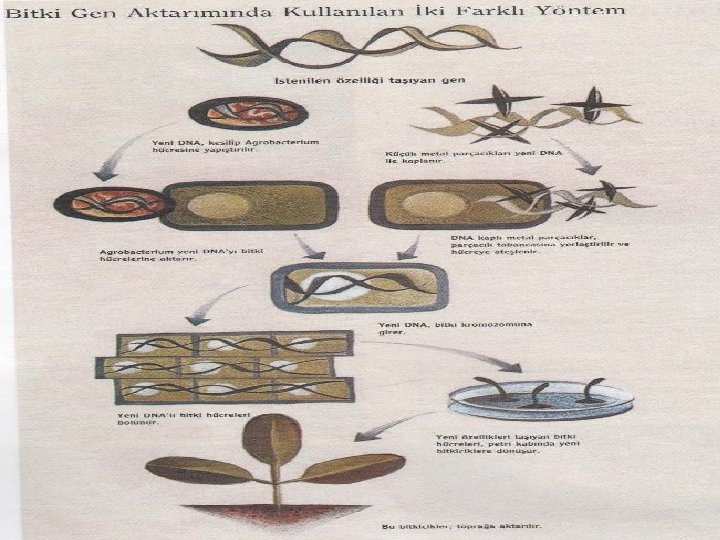 Gen Transfer Yöntemleri Bitkilerde dolaylı gen transferi: İstenilen özelliği taşıyan gen bitkiye Agrobacterium kullanılarak aktarılır. Bitkilerde doğrudan gen transferi: İstenilen özelliği taşıyan gen, hedef hücreye gen tabancası, partikül bombardımanı gibi yöntemlerle aktarılır.