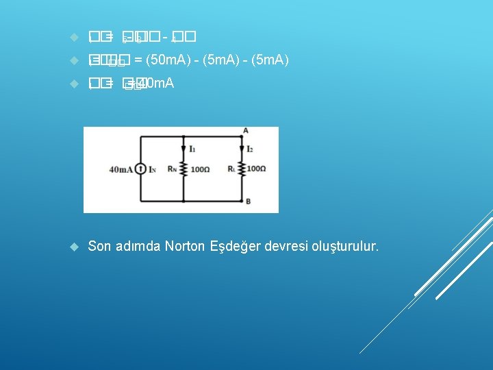 Bu teoreme göre doğrusal iki uçlu devre, aynı özelliği gösterebilecek bir �� akım kaynağı ve bu kaynağa paralel bağlı �� bir � direnci ile ifade edilebilir. �� ��iki uç arası kısa devre akımını, � ise bağımsız kaynaklar kapatıldığında iki uç arasındaki �� � eşdeğer direnci gösterir. (�� ) �= � �� ��ℎ � direnci; Thevenin teoremindeki �� direncini bulmak için �� � ��ℎ izlenen adımların aynısı uygulanır.