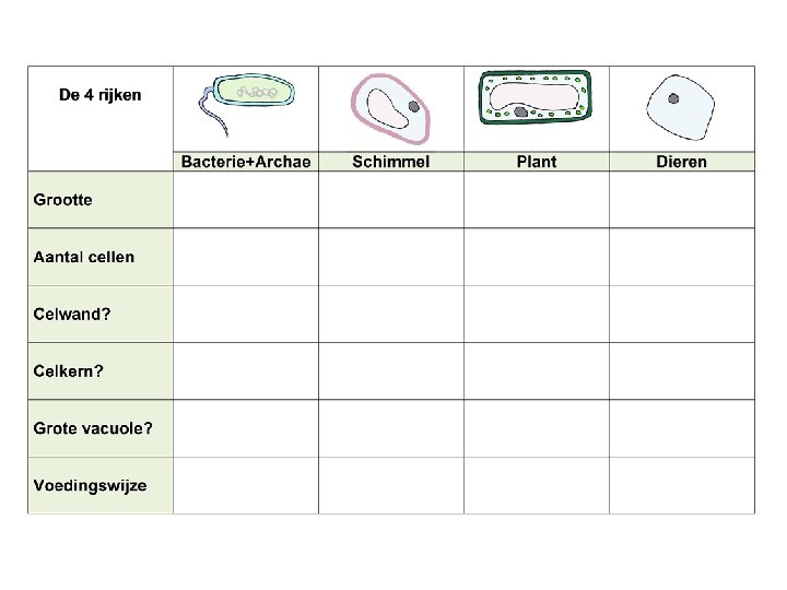 Eukaryoten Bacteriën Archaea - < gemeenschappelijke voorouder Schimmels Planten Dieren Protisten