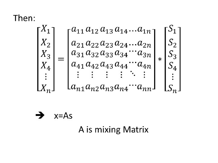 • Also written as • Independent components are latent variables meaning they cannot be directly observed • The mixing matrix is assumed to be unknown. • All observe is the random vector x, and must estimate both A and s by using it. • This must be done under as general assumption as possible.