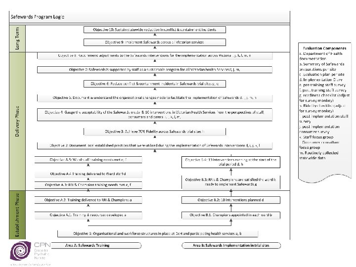 Safewards Victorian Trial Training and preimplementation support Implementation Embedding within services Evaluation Evaluate against objectives for: Learning Practice change Experience Effectiveness Sustainability