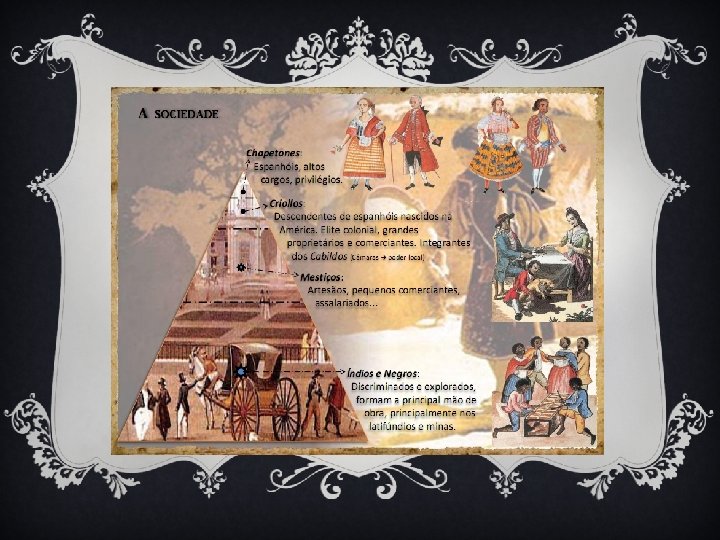 A ELITE COLONIAL, DIVIDIA-SE EM: v Criollos – eram descendentes de espanhóis nascidos na América. v Chapetones – eram pessoas nascidas na metrópole e que possuíam todos os privilégios e ocupavam os altos cargos administrativos v Camada intermediaria – era formada por comerciantes, advogados, médicos, professores, artesões, etc. v Camada dominada – era formada pela grande maioria da população.