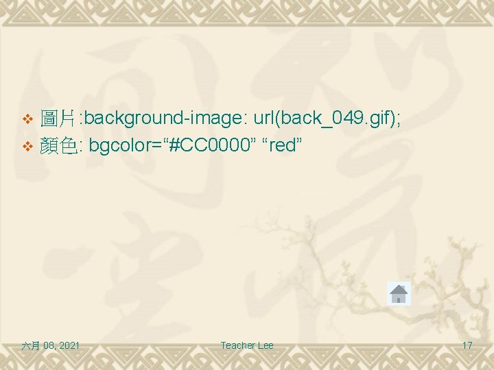 圖片: background-image: url(back_049. gif); v 顏色: bgcolor=“#CC 0000” “red” v 六月 08, 2021 Teacher Lee 17