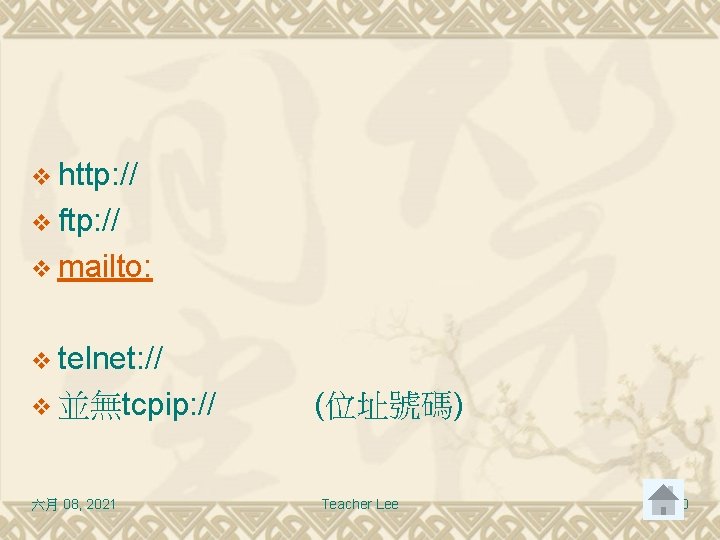 v http: // v ftp: // v mailto: v telnet: // v 並無tcpip: // 六月 08, 2021 (位址號碼) Teacher Lee 20