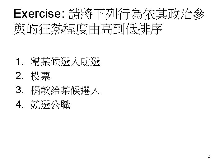 Also remember some important issues about measurement: • Attributes and variables: mutually exclusive and exhaustive • Unidimensionality (單一向度): all the items in a scale or index fit together (i. e. , they measure the same thing. ) 3