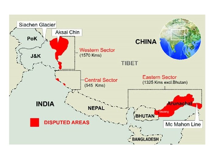 Reasons for Dispute Border Dispute : 1. Aksai Chin area in Kashmir. ( Eastern Front) 2. Claim over NEF (Arunchal Pradesh) 3. Issue of Tibet 4. China refuses to acknowledge the Mac. Mahon Line 5. Beijing argued there was no demarcated boundary between India and China along the Himalayan Ridges. 6. But New Delhi stick to Mc. Mohan Lines. 7. Nehru’s Government granted Dalai Lama asylum in India in 1959. This is argued for the main reasons for China aggresion over India.