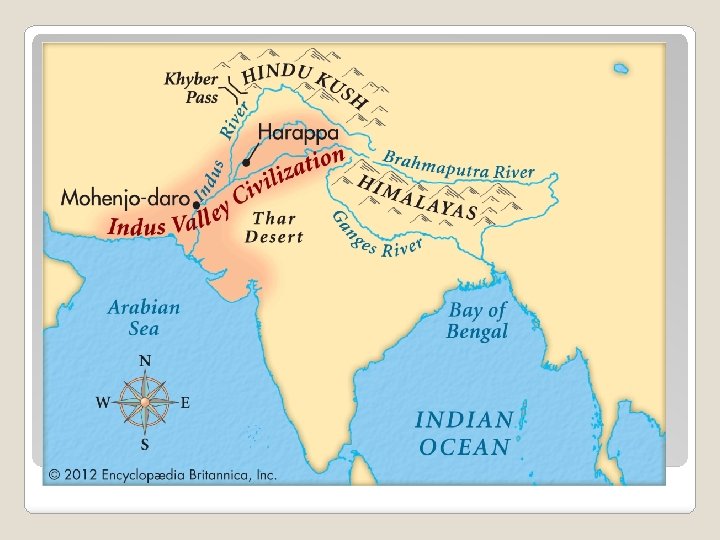 �Stretches south from the Himalayas ◦ Highest mountain range in the world ◦ Subcontinent in the Indian Ocean �Geography limited contact with other cultures ◦ Himalaya and Hindu Kush Mountain Ranges ◦ Bay of Bengal, Indian Ocean, Arabian Sea �Passes in the mountains ◦ Allowed for migration into the Indus River Valley �Great rivers begin in the mountains ◦ Indus River ◦ Ganges River ◦ Make farming possible down below Location & Geography