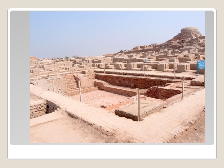 �Built above ground level ◦ To protect from floods �Homes and workshops on one side of the city ◦ Public buildings on the others �Highest point of the city served as the citadel ◦ Fortress ◦ Built on a high mound of earth ◦ Enclosed by a high brick wall ◦ Would have protected most important buildings �Storehouse for grain �Bath house �Clay pipe drains ran under the brick streets ◦ Carried waste out of the city �Canals outside the city to handle the flooding ◦ Redirected the water to where it was needed Mohenjo-Daro: Carefully Built