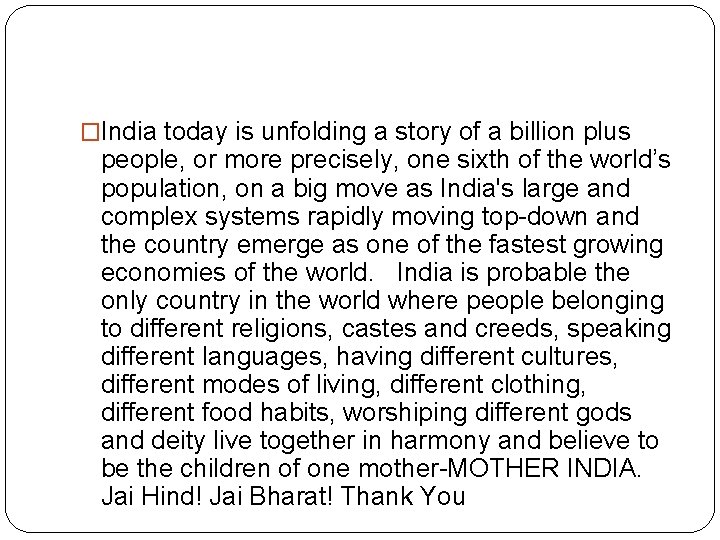 �India today is unfolding a story of a billion plus people, or more precisely, one sixth of the world’s population, on a big move as India's large and complex systems rapidly moving top-down and the country emerge as one of the fastest growing economies of the world. India is probable the only country in the world where people belonging to different religions, castes and creeds, speaking different languages, having different cultures, different modes of living, different clothing, different food habits, worshiping different gods and deity live together in harmony and believe to be the children of one mother-MOTHER INDIA. Jai Hind! Jai Bharat! Thank You