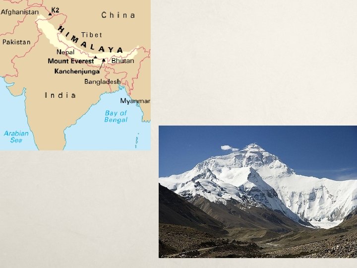 3 Major Land Regions 1. Himalayas – tallest mountain system in the world; run along the country’s northern border Himalayan Mountains 2. Indo- Gangetic (Gangetic Plain)- Excellent farmland South of the Himalayas, it stretches about 1, 500 miles across northern India Half of the population lives in this region 3. Deccan Plateau – forms most of the triangle shaped peninsula; surrounded by many hills/mountains and valleys