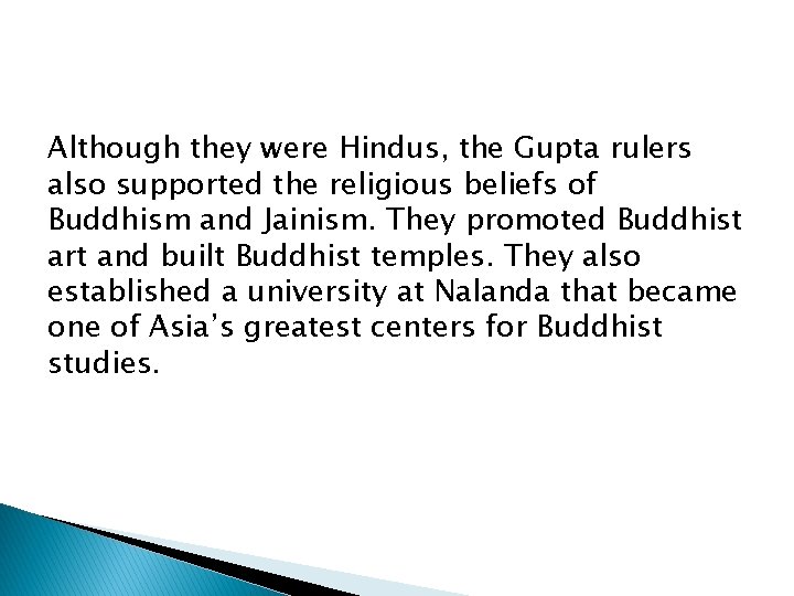 Although they were Hindus, the Gupta rulers also supported the religious beliefs of Buddhism and Jainism. They promoted Buddhist art and built Buddhist temples. They also established a university at Nalanda that became one of Asia’s greatest centers for Buddhist studies.