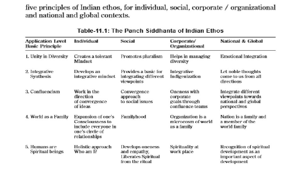 Towards an Indian model of Corporate development • Idea # 1: Human welfare or the Loksangraha • Sarva bhavantu sukhina, sarve shantu nirmaya • Idea # 2: Unattached action or the Nishkam karma • Dettached action without longing for the immediate result • Idea # 3 : Ethical profits or the Shubh Labh • Wealth generation though ethical means • Idea # 4 : Self development : Divinity in Human Beings • Every soul is potentially divine • Idea # 5 : Work as Worship When work is treated as worship it leads to excellence in task performance • Idea # 6 : The concept of family, Kutumbh • Entire world is one family • Idea # 7 : Avoidance of Extremes • It implies balancing and steering through the middle or alternative approaches to the extreme solutions