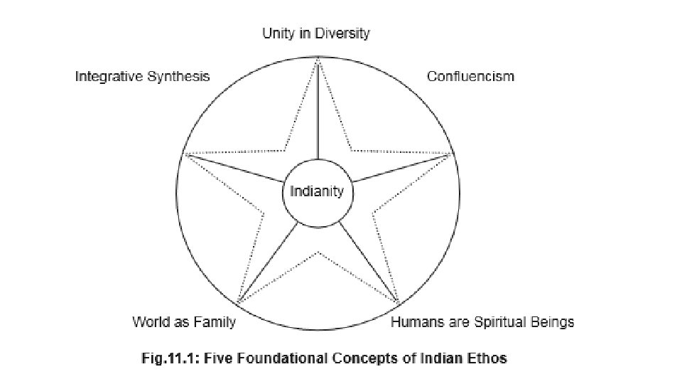 Indian Ethos and Indianity The expression, Indian ethos has different meaning for different persons. Hence, defining Indian ethos has been a difficult proposition. It is essential for us to understand the essence of the Indian ethos which provide the basis for functioning of the social systems, organizations and individual selfdevelopment. Basically Indian ethos can be defined as a sum total of the Indian traditions and modifications and enrichment in traditions to suit the requirement of changing times. The following could be considered as core ideas of the Indian ethos. • Unity in diversity • Integrative Synthesis • Confluencism • World as a family • Humans as Spiritual being