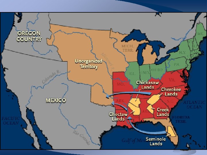 Cherokee Indians • Lived peacefully in the Appalachian Mountains of Georgia and Tennessee • Adopted culture of whites wrote and spoke English • Had own written language and newspaper • Based their government on the U. S. Constitution