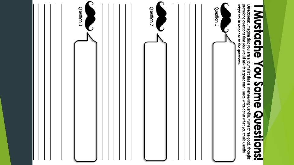 Teachers • Divide the class into 6 groups and print off the following quotation pages (1 per group). • Have the students read & discuss what they think Gandhi meant and what the quote means to them. • After discussing, the students should write a Quick Quotation Response (usually a paragraph). *The directions are after the quotations.