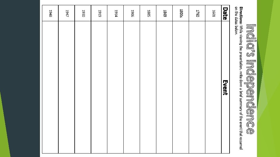 Independence • Many Indians followed Gandhi’s nonviolent acts of protest and forced the British to recognize their desire for independence. • After fighting in WWII, Britain no longer had enough money or people to keep India under its rule. • On August 15, 1947, Great Britain formally gave up their colonial claims to India and the Republic of India was established. • Today, many Indians credit India’s independence to the efforts of Gandhi.