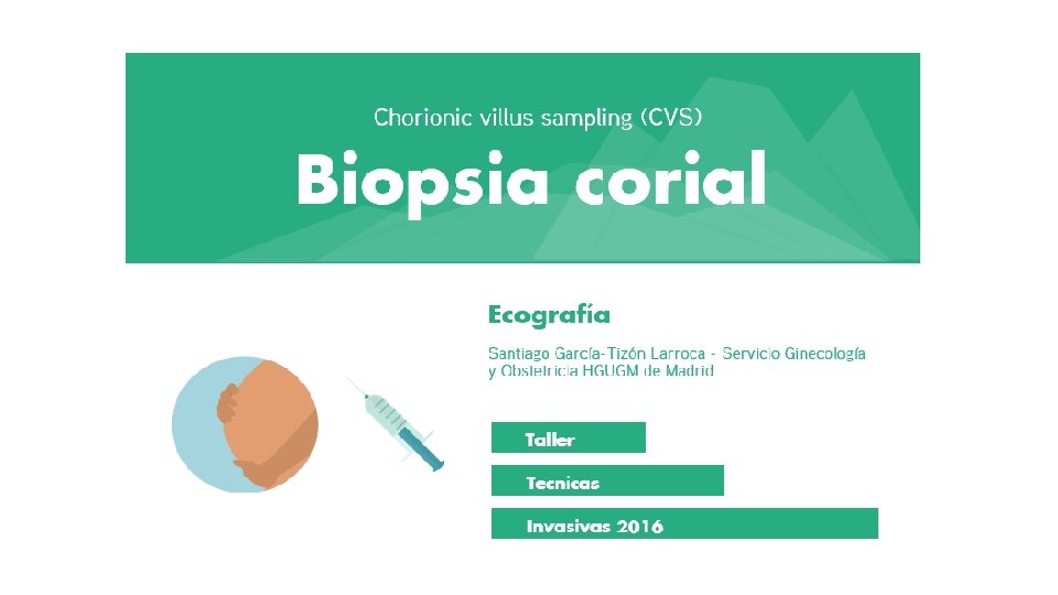 ABORTO PERDIDA PERINATAL 6 vs 7/1000 RNV (Amnio vs BC) BC 4. 6 % < AMNIO PERDIDA GESTACION MULTIPLE Pocos estudios 2. 75 % perdida gest < 28 sem DIAGNOSTICO INCIERTO/FALSO 0. 4 % Mosaicismo placentario AMNIO de confirmación FALLO OBTENCION MUESTRA <1% MOSAICISMO PLACENTARIO 1 -2 % BC Mosaicismo fetal 10 % Tipo 1 (+ frecuente) Tipos 2 -3 (posible afectación fetal) DEFECTOS MIEMBROS-HIPOGENESIS MANDIBULAR < 9 semanas EG SANGRADO 7 -10% INFECCION HEMORRAGIA FETO-MATERNA RPM