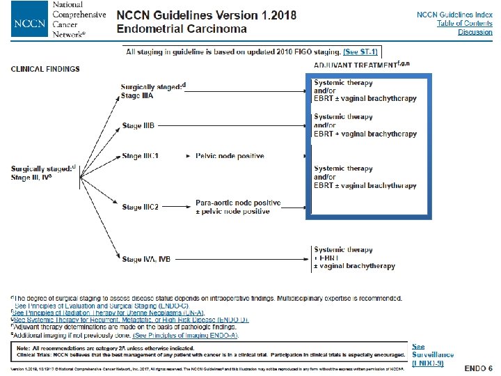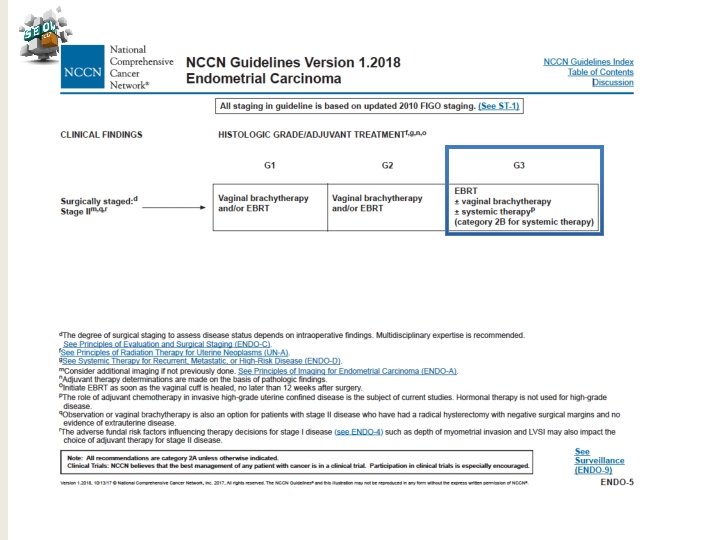 Adyuvancia QT: GOG 258 “A randomized phase III trial of Cisplatin and tumor volume directed irradiation followed by carboplatin and paclitaxel vs carboplatin and paclitaxel for optimally debulked, locally advanced endometrial carcinoma ” N= 407 Pacientes E III-IVA(FIGO 2009) N= 813 EI o II de céls claras o seroso con citología + PS 0 -2 CDDP 50 mg/m 2 d 1 y 29 + RT externa 45 Gy +/-BQ Seguido de carbo AUC 5+ taxol 175 mg/2 /21 d x 4 c GCSF Objetivo primario: SLR Objetvo secundario: SG, Toxicidad, QL Carbo AUC 6+ taxol 175 mg/2 /21 d x 6 c N= 406 Estratificación Edad >/< 65 y tamaño enfermedad residual Matei D et al ASCO 2017