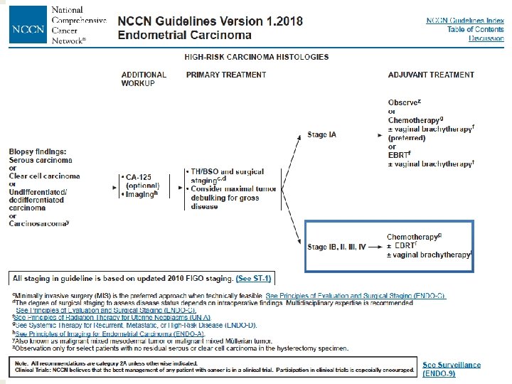 Adyuvancia QT: GOG 258 “A randomized phase III trial of Cisplatin and tumor volume directed irradiation followed by carboplatin and paclitaxel vs carboplatin and paclitaxel for optimally debulked, locally advanced endometrial carcinoma ” Conclusiones ü QT-RT no demuestra superioridad comparado con QT (HR 0. 9, CI 0. 74 -1. 1) ü Toxicidad aguda similar ambas ramas ü QT-RT reduce la incidencia de recaídas vaginales, pélvicas y paraaórticas con respecto a QT ü La recaída a distancia es más frecuente en QT-RT vs QT ü Los resultados en SG y QL se reportarán en el futuro