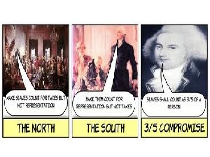 Compromise…. . • The Great Compromise – Virginia Plan + New Jersey Plan – 2 houses; = representation and proportional population! • North-South Compromise – Three-fifths compromise – For determining proportional representation!
