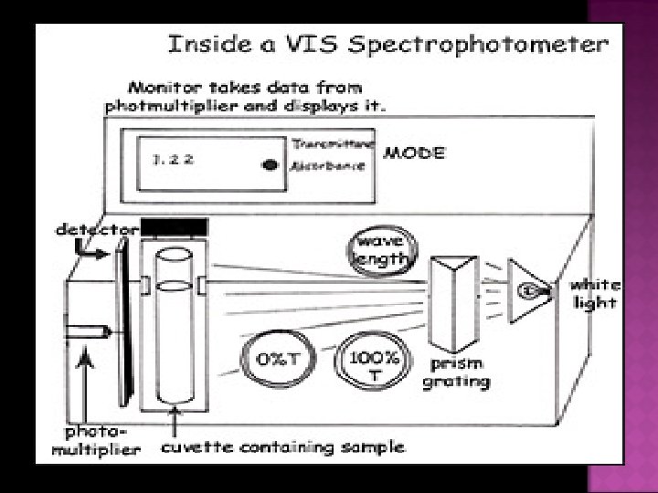 �The wavelength of light produced by the tungsten lamp range from about 350 nm (Violet light) to 700 nm (red light). �The molecules in the sample either absorb or Transmit the light energy of one wavelength or another.