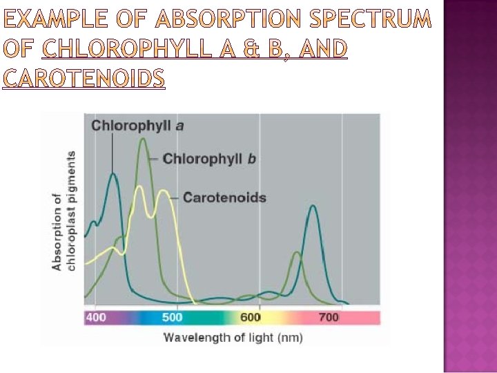 The spectrophotometer can measure the amount of absorbance or lack of absorbance of different colored light for a given molecule.