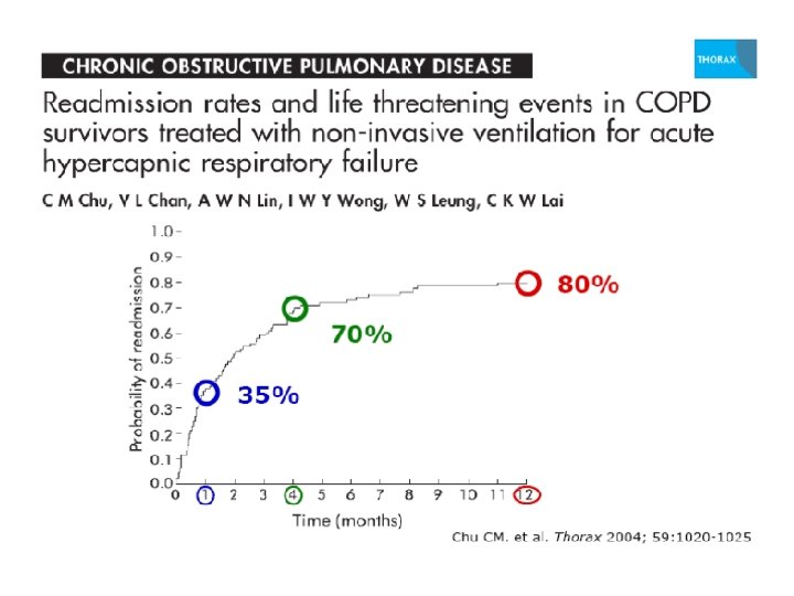 COPD : LONG – TERM SURVIVAL % SURVIVAL 100 80 O 2 60 T NOTT O 2 12 H (n = 101) NOTT O 2 24 H (n = 101) BMRC O 215 H (n = 42) BMRC control (n = 45) ROBERT (N = 50) MUIR (n = 256) 40 20 0 YEARS 0 2 4 6 8 10 12 Muir et al, Chest, 1994, 106: 207
