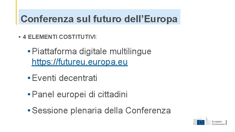 Conferenza sul futuro dell’Europa • 4 ELEMENTI COSTITUTIVI: • Piattaforma digitale multilingue https: //futureu. europa. eu • Eventi decentrati • Panel europei di cittadini • Sessione plenaria della Conferenza
