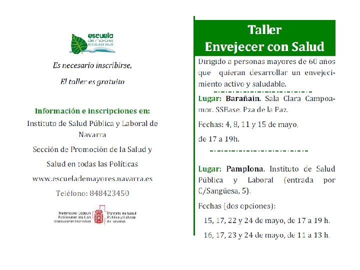 Talleres de la Escuela de Mayores Primavera 2017 Taller/Lantegia ENVEJECER CON SALUD Dirigido a mayores de 60 años. ZAHARTZAROA N ERE OSASUNTSU 60 urtetik gorakoentzat Adinekoen Eskolako lantegiak 2017 ko udaberria Lugar/Non Fechas/Data Etxarri Aranatz. 3, 4, 8 y 10 mayo Club Jubilados Gure Ametsa jubilatuen elkartea. Kale Nagusia, 15. Maiatzak 3, 4, 8 eta 10 17: 00 – 19: 00 Barañain. 4, 8, 11 y 15 mayo Sala Clara Campoamor aretoa. SSBase/Oinarrizko GZ. Pza de la Paz/Bakearen plaza Maiatzak 4, 8, 11 eta 15 Ezcároz/Ezkaroze. 9, 11, 16 y 18 mayo Centro de Salud/Osasun etxea. Rochapea/Arrotxapea, 14. Maiatzak 9, 11, 16 eta 18 Pamplona/Iruña. Aula ISPLN*/ NOPLOIaren gela* Hora/Ordutegia 17: 00 – 19: 00 15, 17, 22 y 24 mayo 17: 00 – 19: 00 Maiatzak 15, 17, 22 eta 24 16, 17, 23 y 24 Mayo 11: 00 – 13: 00 Maiatzak 16, 17, 23 eta 24 *ISPLN: Instituto de Salud Pública y Laboral de Navarra. C/Leire, 15 (entrada por C/Sangüesa, 5). Pamplona. *NOPLOI_ Nafarroako Osasun Publikoaren eta Lan Osasunaren Institutua. Leire kalea 15, Iruñea (sarrera, Zangoza kaleko 5. etik). Los talleres se realizarán en castellano Talleres gratuitos, previa inscripción en el teléfono 848423450 (de 8 a 15 h) y en la página web. Debaldeko lantegiak , aurretik izena emanez 848423450 telefonoan (8 etatik 15 ak arte) eta webgunean. http: //www. navarra. es/home_es/Temas/Portal+de+la+Salud/Ciudadania/Escuela+de+Salud/Escuel a+de+Mayores/ Lantegiak gaztelaniaz izanen dira