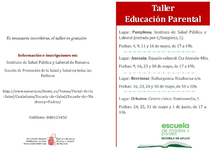 Talleres de la Escuela de Madres y Padres Primavera 2017 Taller/Lantegia EDUCACIÓN PARENTAL Para madres y padres con hijos e hijas entre 6 y 12 años. HEZKUNTZA GURASOEN 6 eta 12 urte bitarteko gurasoentzat Lugar/Non Pamplona/Iruña. Gurasoen Eskolako lantegiak 2017 ko udaberria Fechas/Data Hora/Ordutegia 4, 9, 11 y 16 mayo 17: . 00 -19: 00 Aula ISPLN*/NOPLOIaren gela* Maiatzak 4, 9, 11 eta 16 Ansoain/Antsoain. 9, 16, 23 y 30 mayo Espacio cultural/Kulturgunea. Cta Ansoain 4 Bis/Antsoain bidea 4 Bis Maiatzak 9, 16, 23 eta 30 Berriozar. 16, 23, 24 y 30 mayo Kulturgunea. Etxaburua (s/n. /z. g. ) Maiatzak 16, 23, 24 eta 30 Orkoien. 24, 25, 31 de mayo y 1 de junio Centro cívico/Gizarte etxea. Euntzeandia, 1. Maiatzak 24, 25 eta 31 eta ekainak 1 17: . 00 -19: 00 18: 00 -20: 00 17: . 00 -19: 00 *ISPLN: Instituto de Salud Pública y Laboral de Navarra. C/Leire, 15 (entrada por C/Sangüesa, 5). Pamplona. *NOPLOI_ Nafarroako Osasun Publikoaren eta Lan Osasunaren Institutua. Leire kalea 15, Iruñea (sarrera, Zangoza kaleko 5. etik). Los talleres se realizarán en castellano Lantegiak gaztelaniaz izanen dira Talleres gratuitos, previa inscripción en el teléfono 848423450 (de 8 a 15 h) y en la página web. Debaldeko lantegiak , aurretik izena emanez 848423450 telefonoan (8 etatik 15 ak arte) eta webgunean. http: //www. navarra. es/home_es/Temas/Portal+de+la+Salud/Ciudadania/Escuela+de+Salud/Escuel a+de+Madres+y+Padres/