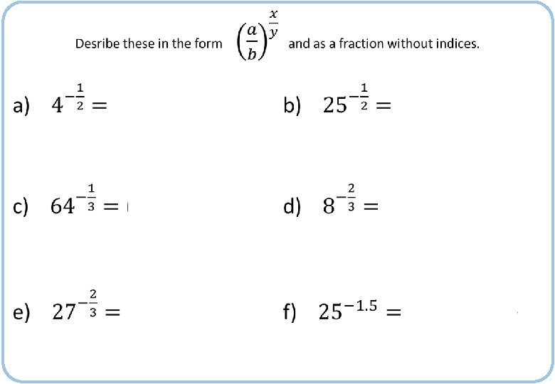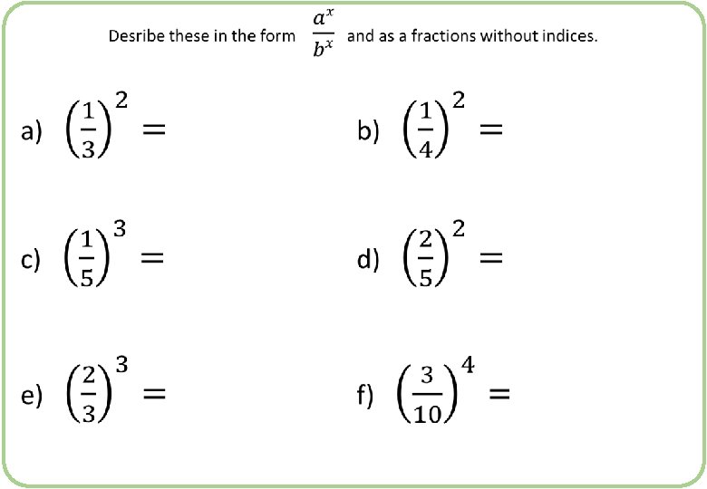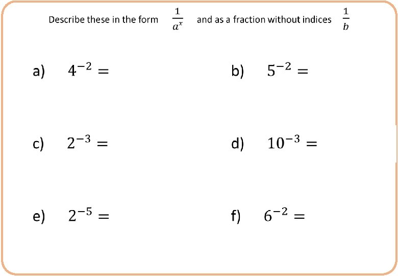 How can we write this as a calculation? A negative indices will create the reciprocal, so a fraction will be ‘flipped’.